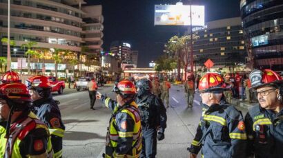 Integrantes del cuerpo de Bomberos de Ecuador custodian los exteriores de un…